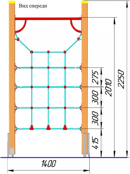 Гимнастический комплекс представляет собой сборноразборную, модульную конструкцию, состоящую из четырех опорных столбов,двух усиленных турников,двух турников под сетку и сетки.На вершины столбов устанавливаются пластиковые заглушки.Оборудование устанавливается и бетонируется на оцинкованные металлические подпятники. Возраст пользователя от 6 до 12 лет. Опорные столбы выполнены из клееного бруса сечением не менее 100*100 мм. с канавкой посередине. Металлические подпятники выполнены из круглой трубы сечением не менее 42 мм. и листового металла толщиной не менее 4 мм. усиленные турники и турники под сетку выполнены из круглой трубы сечением не менее 34 мм., листового металла толщиной не менее 4 мм. Сетка выполнена из полипропиленового каната с металлическим сердечником сечением не менее 16 мм. и специальных крепежных метизов. Все металлические элементы выполнены с применением высокоточного оборудования. Деревянные элементы изготавливаются на полуавтоматизированной линии по обработке деревянных изделий. Все деревянные элементы изготавливаются из хвойной доски влажностью 7-10%, подвергаемой склейке по длине и ширине заготовки с применением клеев зарубежных производителей; изгибы, радиусы и скругленные кромки тщательно отшлифованы и обработаны краской для закрытия торцов JRM (ГОСТ Р 52169-2012 п.4.3.11). Все деревянные элементы проходят окраску в три слоя: первый слой – грунтование заготовки с последующим шлифованием поверхности, второй слой – покраска вододисперсионной краской с последующим шлифованием поверхности, третий слой – финишная покраска. Все деревянные элементы окрашиваются краской финского производителя TEKNOS, соответствующей требованиям санитарных норм и экологической безопасности. Все металлические элементы изготавливаются из круглых труб, с применением горячекатаного листа. Весь применяемый металлопрокат соответствует ГОСТ 10705-80, ГОСТ 1577-93. Сварные швы конструкций из металла гладкие (ГОСТ Р 52169-2012 п.4.3.10). Все металлические элементы окрашиваются порошковой краской финского производителя TEKNOS, соответствующей требованиям санитарных норм и экологической безопасности. Для более качественного прокраса все металлические элементы проходят двойной цикл покраски. Крепеж оцинкован.Выступающие части резьбовых соединений закрыты пластиковыми заглушками (ГОСТ Р 52169-2012 п. 4.3.9). Крепление элементов оборудования исключает возможность их демонтажа без применения инструментов (ГОСТ Р 52169-2012 п. 4.3.13). Изделие сопровождается: а) техническим паспортом завода-изготовителя (ГОСТ Р 52301-2004 п. 5), в котором указано предназначение, номер изделия, правила безопасной эксплуатации и схема сборки. б) комплектом крепежа для сборки и монтажа. Сборочно-монтажные работы выполняются с соблюдением требований национальных стандартов по установке детского игрового оборудования и согласно схемам монтажа предприятия-изготовителя.