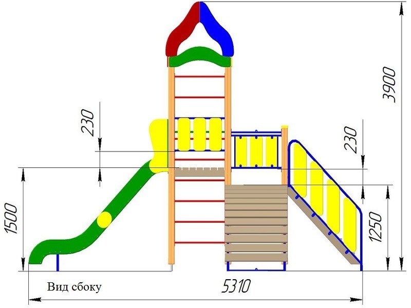 Игровой комплекс представляет собой сборноразборную, модульную конструкцию, состоящую из шести опорных столбов, две разноуровневые площадки, одной башней под крестообразной крышей, двух ограждений, выполненных в виде металлического каркаса с фанерными экранами, одной гимнастической стенки из турников, одного ската горки с высотой стартового участка не менее 1450мм, одного лестничного марша с двумя перилами, выполненными в виде металлического каркаса с фанерными экранами, одного снаряда для подъема «трап» с полипропиленовым канатом, турников. Оборудование устанавливается и бетонируется на оцинкованные металлические подпятники. Возраст пользователя от 7 лет. Опорные столбы выполнены из клееного бруса сечением не менее 100мм*100мм с канавкой посередине. Площадки выполнены из доски сечением не менее 100мм*40мм. Металлические подпятники, выполнены из круглой трубы сечением не менее 42мм и листового металла толщиной не менее 4мм. Крестообразная крыша выполнена из фанеры толщиной не менее 15мм и листового металла толщиной 4мм. Лестничный марш выполнен из сухой доски сечением не менее 140мм*40мм. Перила к лестничному маршу выполнены из круглой трубы сечением не менее 27мм, листового металла толщиной не менее 4мм и фанеры толщиной не менее 15мм. Ограждение выполнено из круглой трубы сечением не менее 27мм, листового металла толщиной не менее 4мм и фанеры толщиной не менее 15мм. Турники гимнастической стенки выполнены из круглой трубы сечением не менее 27мм и листового металла толщиной не менее 4мм. Скат горки выполнен из фанеры толщиной не менее 24мм и единого листа нержавеющей стали толщиной не менее 1,5мм. Скат горки имеет металлический каркас, выполненный из профильной трубы сечением не менее 20мм*40мм. Стартовый участок горки имеет ограждения, выполненные из фанеры толщиной 24мм и имеет турник – ограничитель, выполненный из круглой трубы сечением не менее 27мм и листового металла толщиной 4мм. Снаряд «трап» выполнен в виде металлического каркаса с досками. Каркас выполнен из круглой трубы сечением не менее 42мм и листового металла толщиной не менее 4мм, доски выполнены из сухой доски сечением не менее 120мм*40мм. Полипропиленовый канат фиксируется между столбов при помощи распорного турника с петлей, выполненного из круглой трубы сечением не менее 27мм и листового металла толщиной не менее 4мм. Все металлические элементы выполнены с применением высокоточного оборудования. Деревянные и фанерные элементы изготавливаются на полуавтоматизированной линии по обработке деревянных и фанерных изделий. Все деревянные элементы изготавливаются из хвойной доски влажностью 7-10%, подвергаемой склейке по длине и ширине заготовки с применением клеев зарубежных производителей; изгибы, радиусы и скругленные кромки тщательно отшлифованы и обработаны краской для закрытия торцов JRM (ГОСТ Р 52169-2003 п.4.3.11). Все деревянные элементы проходят окраску в три слоя: первый слой – грунтование заготовки с последующим шлифованием поверхности, второй слой – покраска вододисперсионной краской с последующим шлифованием поверхности, третий слой – финишная покраска. Все деревянные элементы окрашиваются краской финского производителя TEKNOS, соответствующей требованиям санитарных норм и экологической безопасности. Все металлические элементы изготавливаются из круглых тр