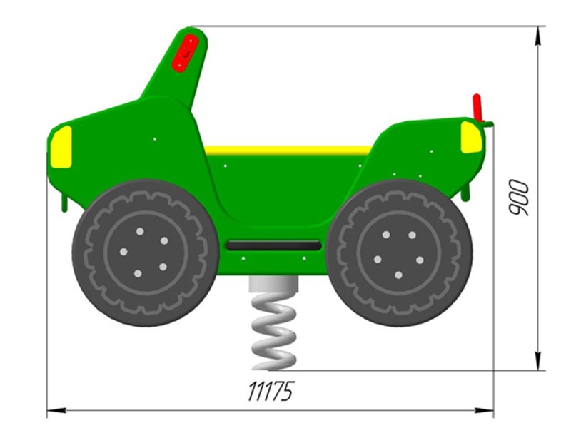 Качалка на пружине имеет сборноразборную конструкцию и выполнена в виде квадроцикла. Качалка включает в себя пружинный механизм, руль, две ручки, двенадцать распорных турников, две боковые части, пол, две средние части, капот, переднюю часть, заднюю часть, багажник, сидение, колеса, заднюю подставку и переднюю подставку. Качалка устанавливается и бетонируется в грунт при помощи основания для бетонирования. Возраст пользователя от 3 до 12 лет. Пружинный механизм выполнен из круглой трубы сечением не менее 133мм, листового металла толщиной не менее 6мм, равнополочного уголка сечением не менее 40мм*40мм и пружины из высокопрочной стали. Две средние части, две боковые части, капот, передняя часть, задняя часть, багажник, сидение и колеса выполнены из влагостойкой фанеры толщиной не менее 24мм. Пол, задняя подставка и передняя подставка выполнены из ламинированной фанеры с противоскользящим покрытием толщиной не менее 24мм. Ручки выполнены из круглой трубы сечением не менее 21мм и листового металла толщиной не менее 4мм. Распорные турники и руль выполнены из круглой трубы сечением не менее 27мм и листового металла толщиной не менее 4мм. Основание для бетонирования выполнено из равнополочного уголка сечением не менее 25мм*25мм и шпильки диаметром не менее 20мм. Все металлические элементы выполнены с применением высокоточного оборудования. Фанерные элементы изготавливаются на полуавтоматизированной линии по обработке фанерных изделий. Все металлические элементы изготавливаются из круглых труб, с применением горячекатаного листа. Весь применяемый металлопрокат соответствует ГОСТ 8509-93, ГОСТ 10705-80, ГОСТ 1577-93. Сварные швы конструкций из металла гладкие (ГОСТ Р 52169-2012 п.4.3.10). Все металлические элементы окрашиваются порошковой краской финского производителя TEKNOS, соответствующей требованиям санитарных норм и экологической безопасности. Для более качественного прокраса все металлические элементы проходят двойной цикл покраски. Все фанерные элементы изготовлены из многослойной влагостойкой, склеенной под прессом и соответствующей ГОСТ 30427-96 фанеры; изгибы, радиусы и скругленные кромки тщательно отшлифованы и обработаны краской для закрытия торцов JRM (ГОСТ Р 52169-2012 п.4.3.11). Окраска фанерных элементов происходит в три слоя: первый слой – грунтование заготовки с последующим шлифованием поверхности, второй слой – покраска двухкомпонентной краской с последующим шлифованием поверхности, третий слой – финишная покраска. Все фанерные элементы окрашиваются краской финского производителя TEKNOS, соответствующей требованиям санитарных норм и экологической безопасности. Крепеж оцинкован. Выступающие части резьбовых соединений закрыты пластиковыми заглушками (ГОСТ Р 52169-2012 п. 4.3.9). Крепление элементов оборудования исключает возможность их демонтажа без применения инструментов (ГОСТ Р 52169-2012 п. 4.3.13). Изделие сопровождается: а) техническим паспортом завода-изготовителя (ГОСТ Р 52301-2004 п. 5), в котором указано предназначение, номер изделия, правила безопасной эксплуатации и схема сборки. б) комплектом крепежа для сборки и монтажа. Сборочно-монтажные работы выполняются с соблюдением требований национальных стандартов по установке детского игрового оборудования и согласно схемам монтажа предприятия-изготовителя.