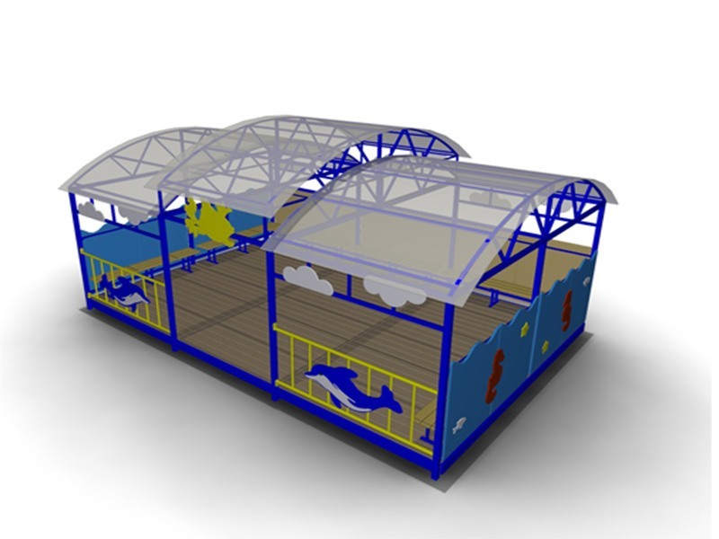 Теневой навес имеет сборную конструкцию. Оборудование включает в себя одну площадку, передние секции с металлическими ограждениями, задние секции, полуфермы, нижние балки, средние столбы, боковые верхние планки, опоры-подпятники, скамьи с опорами, соединительные профили, фанерные ограждения с декоративными накладками в виде морских животных, декоративные дельфины, золотая рыбка и облака. Оборудование устанавливается и бетонируется на оцинкованные металлические подпятники.   Площадка выполнена из клееного бруса сечением не менее 100мм*100мм с канавкой посередине и хвойной доски влажностью 7-10% сечением не менее 140*40мм. Металлические подпятники и ограждения передних секций выполнены из круглой трубы сечением не менее 42мм и листового металла толщиной не менее 4мм. Передние, задние секции и средние столбы выполнены из профильной трубы сечением не менее 60мм*60мм, равнополочного уголка сечением не менее 75мм*75мм и листового металла толщиной не менее 6мм. Полуфермы выполнены из профильной трубы сечением не менее 40мм*20мм. Нижние балки выполнены из равнополочного уголка сечением не менее 75мм*75мм и листового металла толщиной не менее 4мм. Боковые верхние планки и соединительные профили выполнены из профильной трубы сечением не менее 40мм*40мм. Сидения скамей выполнены из хвойной доски влажностью 7-10% сечением не менее 100*40мм. Опоры скамей выполнены из профильной трубы сечением не менее 40мм*20мм. Фанерные ограждения выполнены из влагостойкой фанеры толщиной не менее 24мм. Декоративные дельфины, золотая рыбка и облака выполнены из влагостойкой фанеры толщиной не менее 15мм. Декоративные накладки на фанерные ограждения выполнены из влагостойкой фанеры толщиной не менее 9мм. Покрытие крыши из сотового поликарбоната толщиной не менее 10мм. Все металлические элементы выполнены с применением высокоточного оборудования. Деревянные и фанерные элементы изготавливаются на полуавтоматизированной линии по обработке х изделий.  Все деревянные элементы изготавливаются из хвойной доски влажностью 7-10%, подвергаемой склейке по длине и ширине заготовки с применением клеев зарубежных производителей; изгибы, радиусы и скругленные кромки тщательно отшлифованы и обработаны краской для закрытия торцов JRM (ГОСТ Р 52169-2003 п.4.3.11). Все деревянные элементы проходят окраску в три слоя: первый слой – грунтование заготовки с последующим шлифованием поверхности, второй слой – покраска вододисперсионной краской с последующим шлифованием поверхности, третий слой – финишная покраска. Все деревянные элементы окрашиваются краской финского производителя TEKNOS, соответствующей требованиям санитарных норм и экологической безопасности. Все металлические элементы изготавливаются из круглых труб, с применением горячекатаного листа. Весь применяемый металлопрокат соответствует ГОСТ 10705-80, ГОСТ 1577-93, ГОСТ 8509-93, ГОСТ 8639-82. Сварные швы конструкций из металла гладкие (ГОСТ Р 52169-2012 п.4.3.10). Все металлические элементы окрашиваются порошковой краской финского производителя TEKNOS, соответствующей требованиям санитарных норм и экологической безопасности. Для более качественного прокраса все металлические элементы проходят двойной цикл покраски. Все фанерные элементы изготовлены из многослойной влагостойкой, склеенной под прессом и соответствующей ГОСТ 30427-96 фанеры; изгибы, 